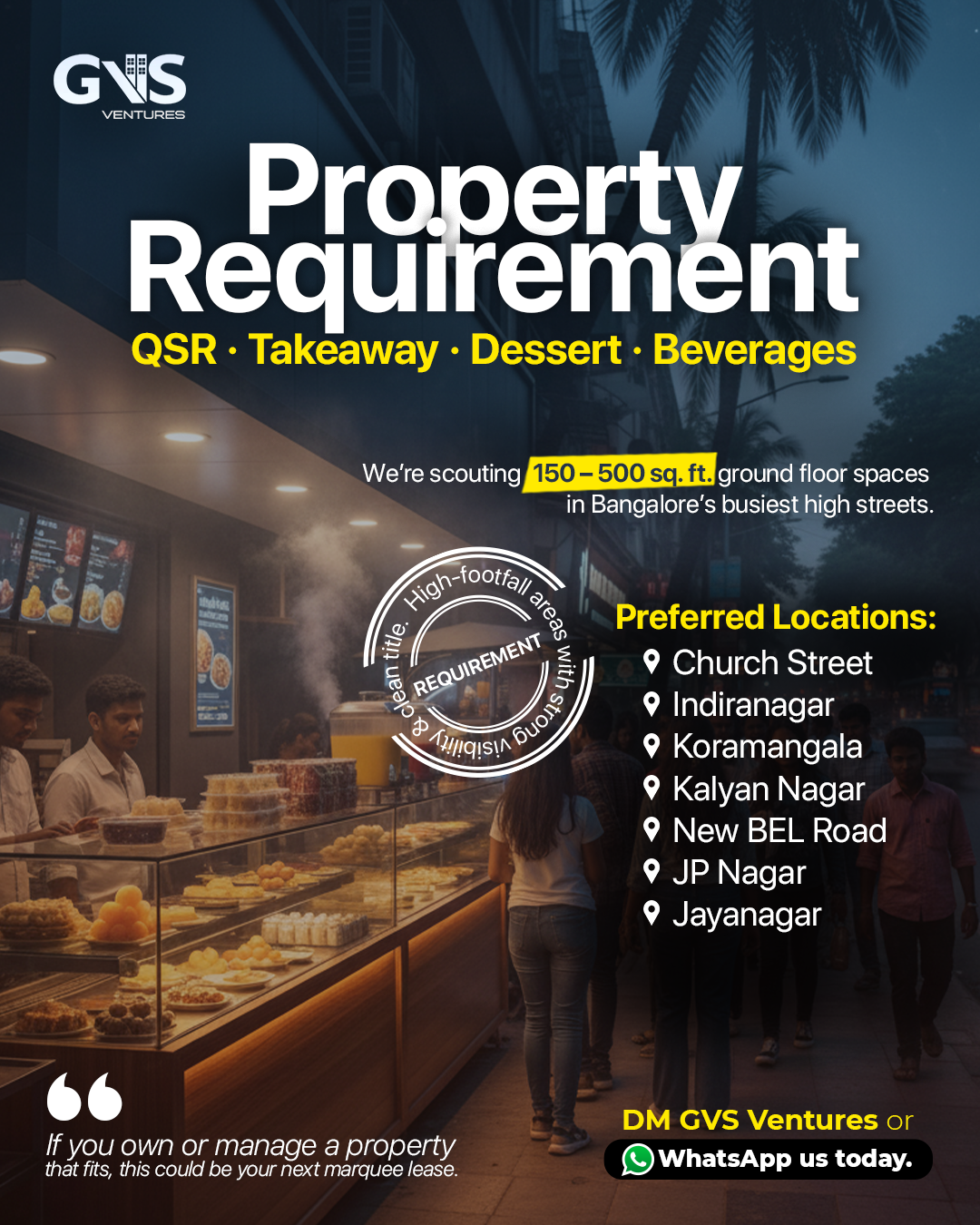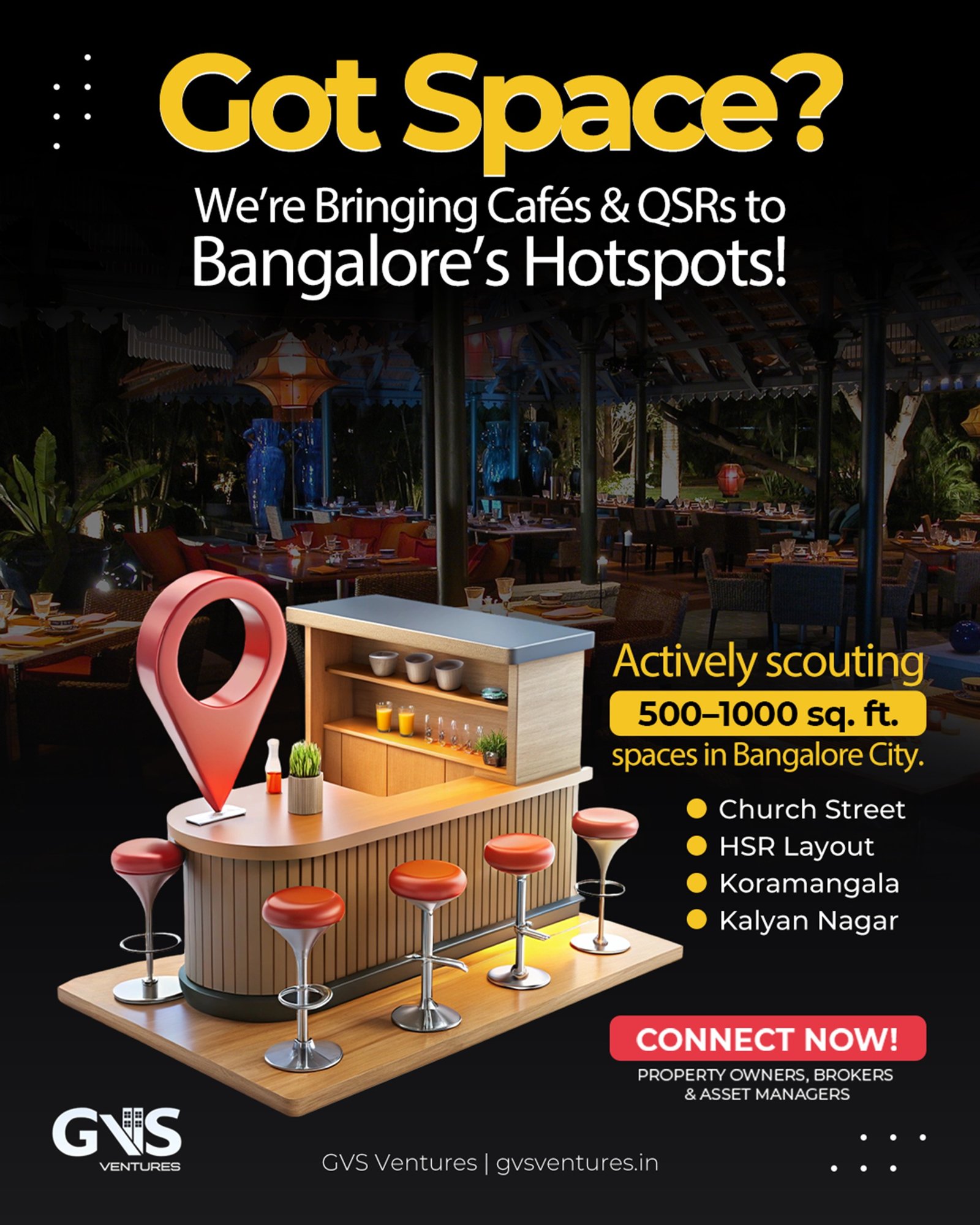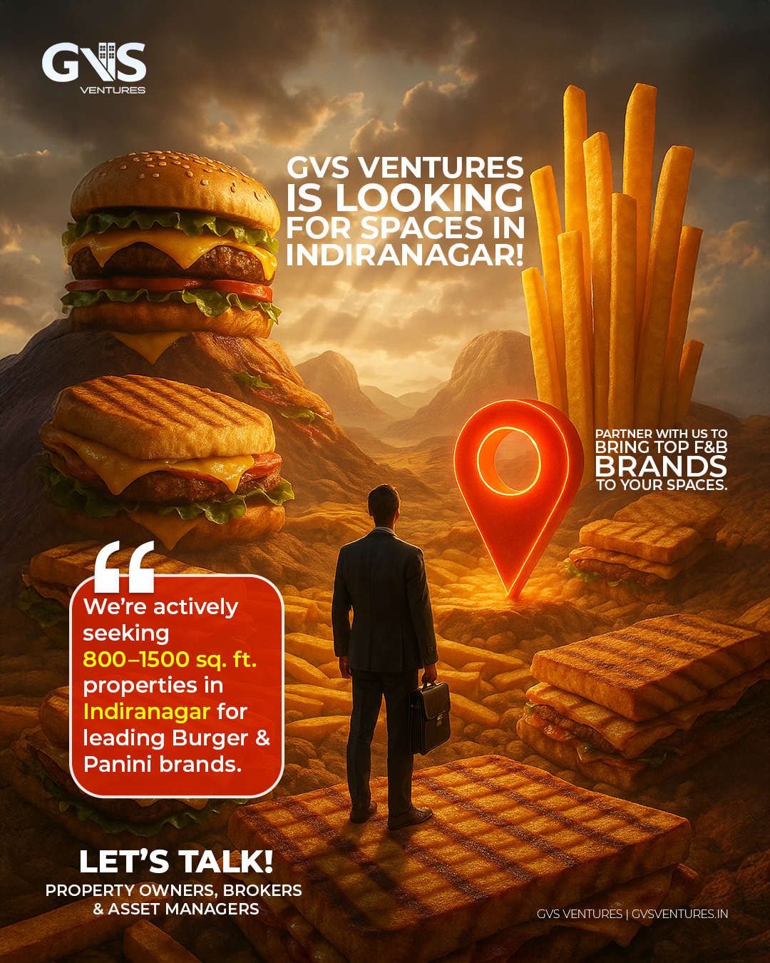 GVS Ventures connects brands with prime commercial real estate across Bangalore, specializing in properties for the F&B, retail, and entertainment sectors. We streamline property solutions through expert leasing, strategic location sourcing, and trusted partnerships.